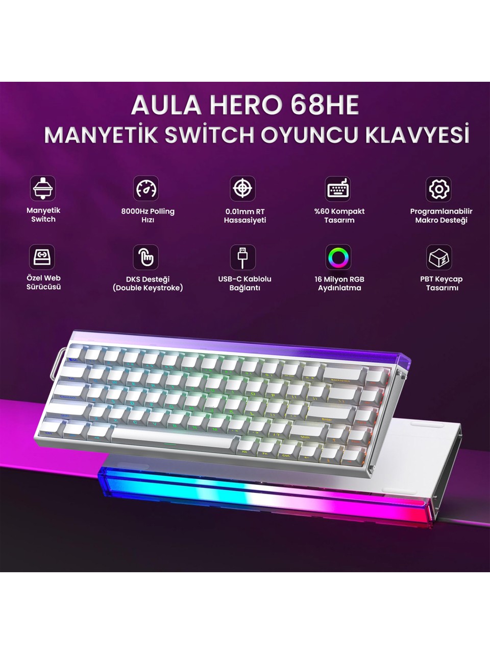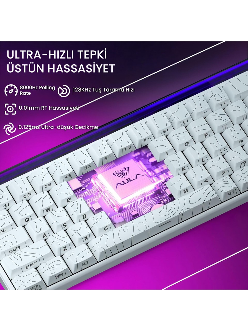 8000Hz Polling Rate: Standart klavyeler saniyede 1000 kez bilgisayara veri gönderirken, bu klavye 8000 kez gönderir. Gecikme süresi sadece 0.125 ms'dir.
