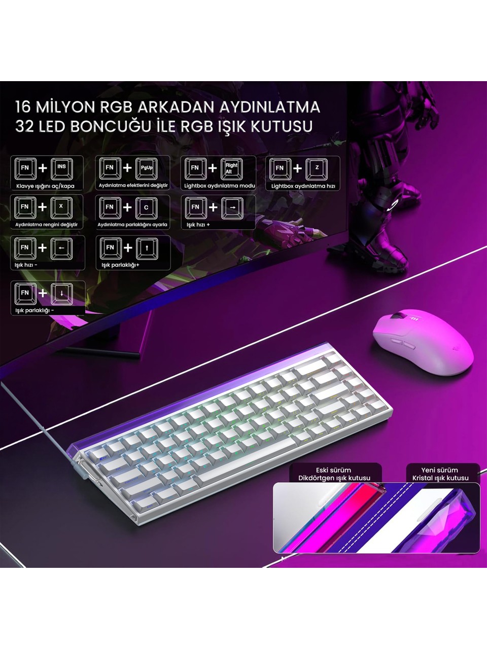 PBT Double-Shot Keycaps: Tuş takımı aşınmaya ve parlamaya dayanıklıdır. Genelde "Side-Printed" (yandan baskılı) tasarımıyla gelir, bu da RGB ışıklandırmanın daha şık görünmesini sağlar.